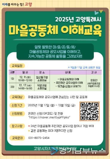[경기남부뉴스 김혜숙 기자] 고양특례시는 시민들의 마을공동체 활동에 대한 이해도와 참여를 높이기 위해 오는 12월 9일과 17일, 두 차례에 걸쳐 ‘2025년 마을공동체 이해교육’을 진행한다고 밝혔다.