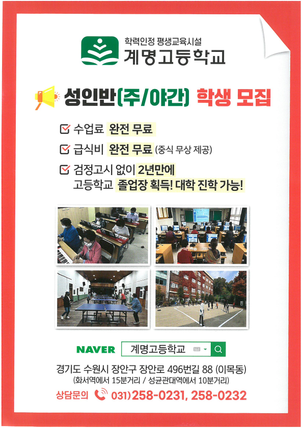 학력인정 평생교육시설 계명고등학교가 성인반(주/야간) 학생을 지금도 모집한다. 수업료, 급식비 완전 무료로 중식을 무료로 제공한다. 검정고시 없이 2년 과정의 수업으로 고등학교 졸업장을 획득한다. 당연히 대학진학이 가능하다.