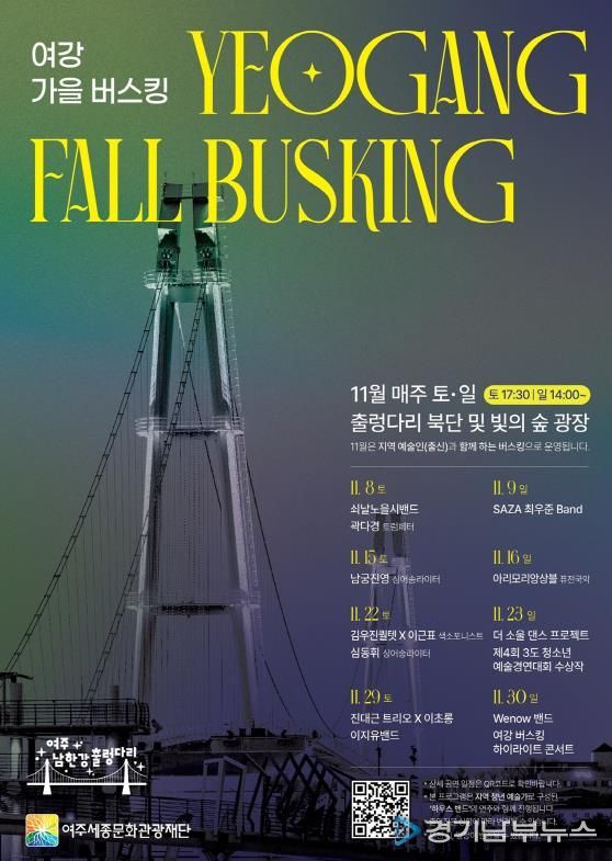 [경기남부뉴스 김혜숙 기자] 여주세종문화관광재단은 9월부터 11월까지 가을 시즌을 맞아 여주 남한강 출렁다리 일원에서 운영한 '여강 폴 나잇 버스킹'이 시민과 관광객들의 큰 호응 속에 성황리에 마무리됐다고 밝혔다.