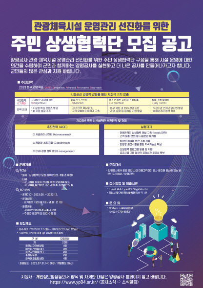 양평공사(사장 신범수, 이하 공사)는 군민 의견을 적극적으로 수렴해 모두가 행복한 시설 운영을 위한 상생협력단을 28일까지 모집한다고 밝혔다.