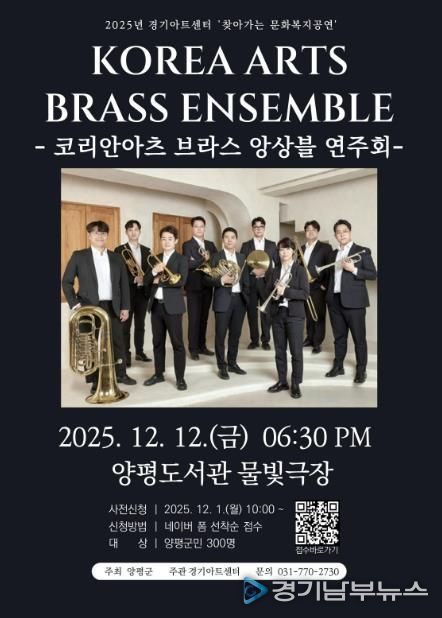 [경기남부뉴스 김혜숙 기자] 양평군은 지역 주민에게 품격 있는 문화 향유 기회를 제공하고자 오는 12월 12일 양평도서관 물빛극장에서 ‘연말 맞이 찾아가는 문화복지 공연’을 개최한다고 밝혔다.