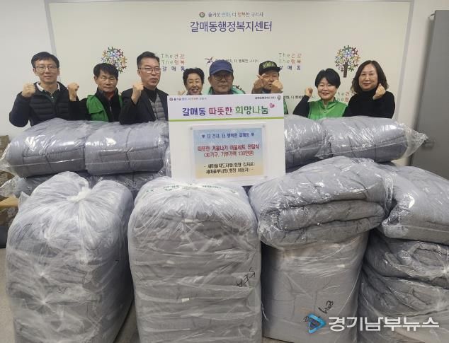 [경기남부뉴스 김혜숙 기자] 구리시는 지난 3일 오후 4시 갈매동 행정복지센터에서 갈매동 새마을지도자회와 새마을부녀회가 에너지 취약계층 30가구에 130만 원 상당의 친환경 겨울 이불 30세트를 지원했다고 밝혔다.