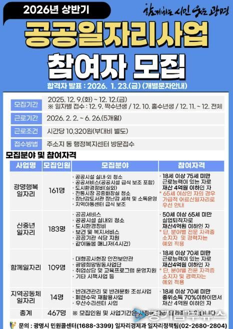 [경기남부뉴스 김혜숙 기자] 광명시가 시민의 일할 권리 보장과 취업 취약계층의 생계 안정을 위해 오는 9일부터 12일까지 ‘2026년 상반기 공공일자리 사업’ 참여자 467명을 모집한다.