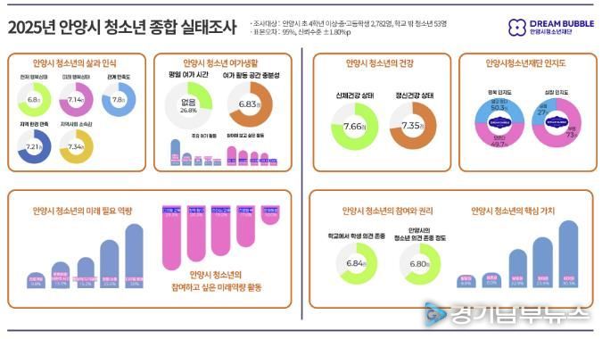 [경기남부뉴스 김혜숙 기자] 안양시청소년재단은 5일 관내 초등학교 4학년부터 고등학교 3학년까지 재학 중인 청소년 2,782명과 학교 밖 청소년 53명을 대상으로 실시한 ‘2025년 안양시 청소년 종합 실태조사’ 결과를 발표했다.