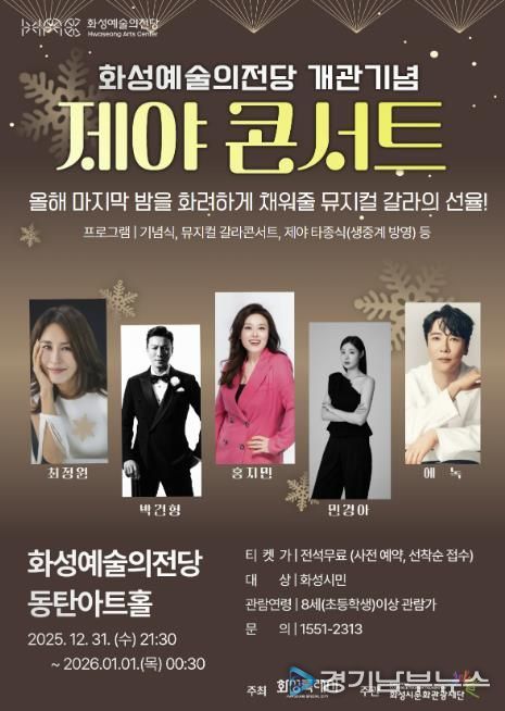 정명근 화성시장은 “이번 ‘화성예술의전당 개관기념 제야 콘서트’는 시민들과 함께 새로운 문화공간의 탄생을 기념하고, 2025년을 의미 있게 마무리하는 소중한 자리”라며 “대한민국을 대표하는 아티스트들의 무대를 통해 개관을 앞둔 공연장의 수준 높은 예술적 가능성을 확인하고, 2026년 정식 개관 준비에도 더욱 만전을 기하겠다”고 말했다.
