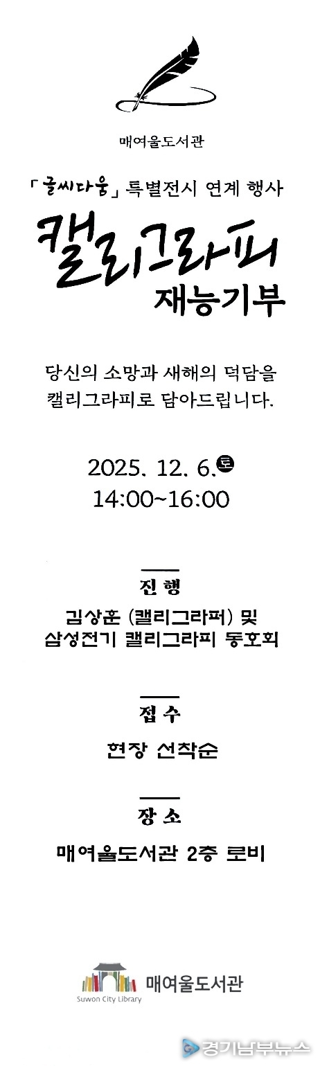 수원시 관계자는 “지역 예술가, 도서관, 기업이 함께 사회에 선한 영향력을 전하고, 시민들에게 ‘글씨다움展’은 새해를 맞아 희망과 기쁨을 전하는 특별한 경험을 선사하고자 마련한 행사”라고 전했다.
