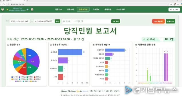 [경기남부뉴스 김혜숙 기자] 김포시가 야간·공휴일 민원 대응 업무에 웹 기반 자동화 시스템을 도입하며 AI 기반 행정혁신에 속도를 내고 있다. 김포시는 당직민원처리시스템 ‘Gimpo 24 : From Sun To Moon’을 외주 없이 전면 2개월간 자체 개발하여 지난 1일 부터 정식 운영에 들어갔다고 밝혔다.