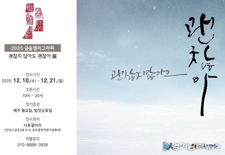 [경기남부뉴스 김혜숙 기자] 공도 작은미술관 시옷갤러리는 오는 12월 10일부터 12월 21일까지 글숲 캘리그라피 작가들이 참여하는 전시 ‘괜찮지 않아도 괜찮아’ 전을 개최한다.