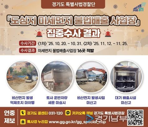 [경기남부뉴스 김혜숙 기자] 경기도는 도심지 미세먼지 발생사업장 330개를 대상으로 불법 배출 행위를 집중 수사해 대기환경보전법 위반 사업장 16개를 적발했다고 9일 밝혔다.