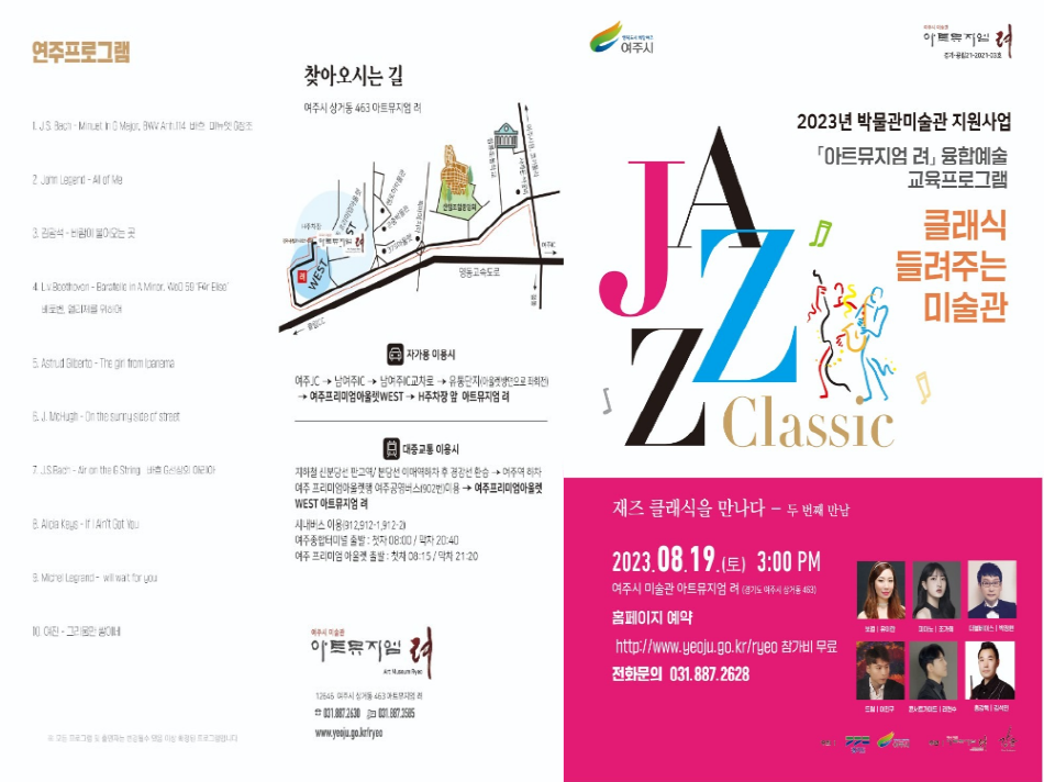 여주시 미술관 「아트뮤지엄 려」는 순수예술과 대중 간의 벽을 낮추고 순수예술에 대한 원활한 소통을 위해 다양한 볼거리를 제공하고자 이번 프로그램을 기획하였다. ‘클래식 들려주는 미술관(8월)’ 프로그램의 사전예약은 「아트뮤지엄 려」 홈페이지(www.yeoju.go.kr/ryeo)를 통해 선착순 예약이 가능하다. 전시 및 공연관람료는 모두 무료이며, 더 자세한 내용은 홈페이지 및 유선전화(031-887-2628)를 통해 안내받을 수 있다.