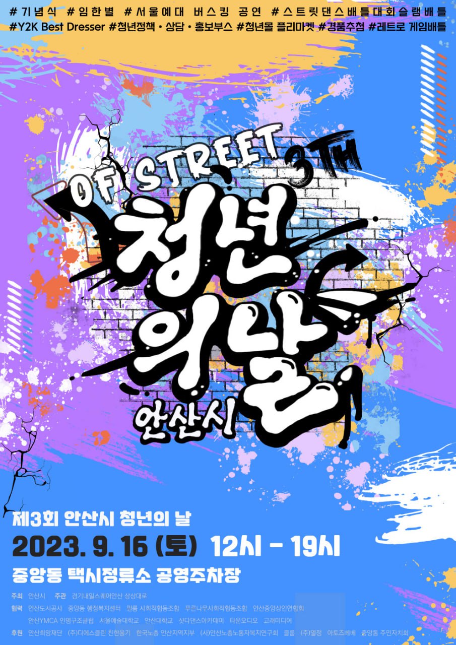 한편, 청년의 날 주요 행사에는 기념식을 시작으로 서울예대 버스킹공연, 스트릿댄스 배틀대회, 문방구 레트로게임, 경품추첨, 플리마켓, 청년정책 홍보 등 청년뿐 아니라 초청가수 임한별을 초청하여 안산의 모든 시민들과 청년들에게 활력과 설렘을 안겨줄 다양한 프로그램이 준비된 축제를 만나볼 수 있다.