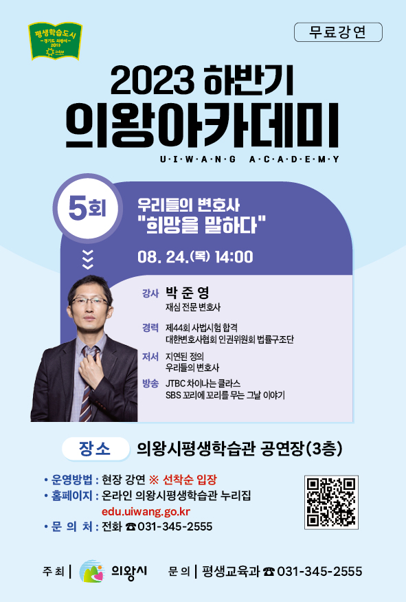 이번 강연은 선착순 무료입장으로 진행되며, 관심 있는 의왕 시민이라면 누구나 참여할 수 있다.