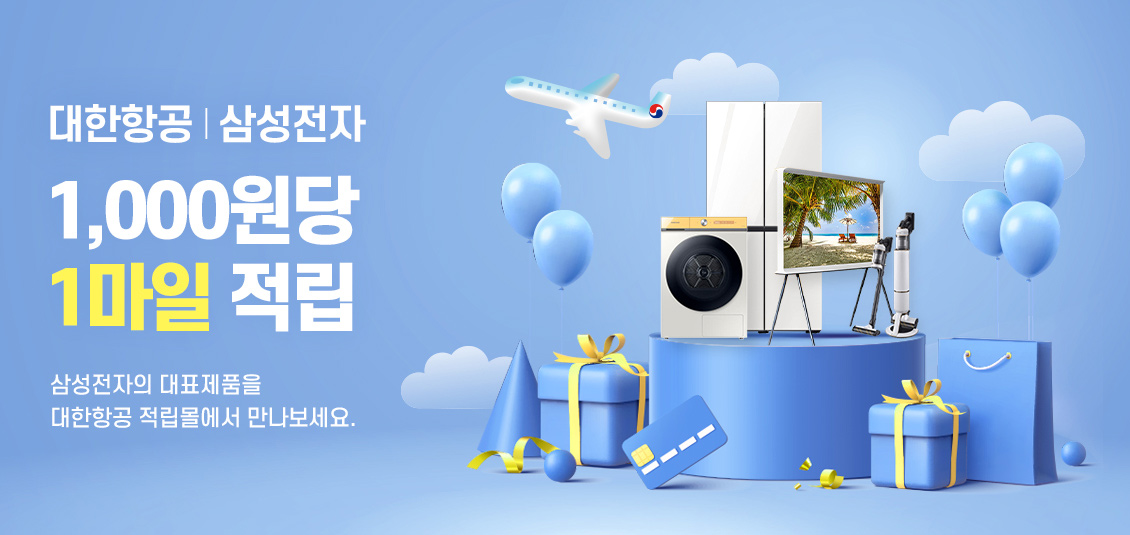 대한항공 ‘삼성전자 적립몰’에서는 스카이패스 회원 누구나 TV, 냉장고 등 삼성전자의 대표 전자제품을 할인된 가격에 구매할 수 있다. 또한 결제금액 1,000원당 대한항공 스카이패스 1마일도 함께 적립 받는다. 스카이패스 회원은 대한항공 홈페이지 스카이패스 ‘여행과 라이프' 메뉴 내 ‘삼성전자 적립몰’에서 이용할 수 있다. 1월 31일까지 ‘삼성전자 적립몰’에서 구매한 고객 전원에게 스타벅스 아메리카노 기프티콘 증정 이벤트도 있다.