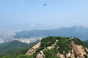 7월 28일 오후에 과천정부청사에서 한국화학융합시험연구원 본원 뒤까지 걸어 백운사 분기점에서 본격적인 백운사능선 시작한다. 계속 고도를 오르다 보니 숨이 헉헉 차오르고, 숲길을 지나 탁 트인 구간 옆을 보니 문원폭포 방향으로 오가는 등로에 사람들도 보이고 계속 오르다 보니 너 심심하지 하며, 독사 등장! 서로 쳐다보다가 내가 무서웠는지 도망하였다. 관악산을 숱하게 다녔지만, 뱀은 처음으로 봤다. 암릉을 넘어서면 또 다른 암릉이 나오고, 드디어 아찔한 슬럼(기차바위) 구간에서 스릴을 맛보며 오른다. 바람 또한 너 재미있나 봐! 하며 순간 돌풍에 몸이 휘청한다. 와우 이런 경험은 처음이다. 잠시 시각적 공포감이 느껴졌고, 검은 먹구름이 밀려오며 바람도 더 세진다. 순간 위협감이 밀려왔다. 후퇴는 없다, 비가 와도 전진. 오르다 보니 1봉 아기 코끼리바위와 2봉 사이를 지나, 3봉은 패스(우회)하고, 4~5봉을 지나 6봉 국기대 도착했다. 잠시 바람에 땀을 식히며 물 한 병을 순간 다 마셨다. 어제 걸어 보았던 광명5산을 보며 관양능선으로 하산을 해 인덕원 8번 입구에서 등산을 종료했다. ■등산코스 : 과천정부청사역8번출구-한국화학융합시험연구원 본원-백운사갈림길