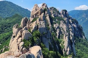 6개의 봉우리와 둘레 4km로 ‘바람이 거세니 바람 소리가 마치 산이 우는 소리 같다고 우는 산이라는 웅장한 암봉으로 이루어진 울산바위 오르다. 설악산 소공원에서 가볍게 준비운동을 하고 무더운 날씨에 지치지 않게 생수믈을 2병을 챙깁니다. 국립공원 랜드마크인 곰돌이 비석을 중심으로 좌측으로는 권금성과 토왕성폭포를 가는 방향이고 우측으로는 우리가 가야 할 울산바위이다. 5월13일에 금강(신선)대에서 웅장한 울산바위를 바라보았고 오늘 울산바위를 오른다. 거리는 얼마되지 않지만 흔들바위부터 급경사에 돌과 나무가 잘 조화된 계단을 오르면 울산바위를 눈 앞에서 볼 수 있는데 산 위에 우뚝 선 바위의 위용이 대단하다. 입을 닫을 수 없을 정도로 감탄과 함께 테크 계단을 힘차게 올라야 한다. 오르기 전 등산하는 여러 사람의 표정들을 보았다. 고소공포증이 있어 계단 손잡이를 굳게 잡고 천천히 호흡하며 오르는 등산객! 세명의 식구 중 아버지는 힘들다고 포기하고 그늘 아래 있고, 엄마와 딸만 올라가는 네달란드 등산객! 처음부터 끝까지 함께 동행한 프랑스 젊은 등산객! 다양한 국적과 다양한 사람들이 울산바위에 올라 감탄과 감동을 머금고 거친 바람을 맞으며 푸른 바다를 보며 쉼