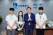 이재준 수원특례시장이 수원시청소년기자단(수원청개구리기자단)과 만나 인터뷰를 하고, 청소년들에게 ‘더 나은 수원’을 만들기 위한 계획 등을 이야기했다고 밝혔다. 수원시청소년청년재단이 운영하는 수원시청소년기자단은 초·중·고등학생 기자단으로 이루어져 있으며, 수원시의 이야기들을 기사로 작성하여 시민들에게 소개한다. 지난 8월 31일 이재준 시장 집무실에서 이뤄진 인터뷰에는 김승헌(매현중 1학년) 기자, 김윤서(다산중 1학년) 기자, 최윤혁(동성중 1학년) 기자 등 3명이 참여했다. 청소년기자단은 이재준 시장에게 ‘더 나은 수원을 만들기 위한 과제’, ‘수원시장으로 이루고 싶은 목표’ 등을 질문했다. 이재준 시장은 “더 나은 수원을 만들기 위해 더 나은 민주주의 체계를 만들어 가겠다”며 “모바일 시정참여 플랫폼인 새빛톡톡이 더 나은 민주주의를 만드는 역할을 할 것”이라고 밝혔다. 이어 “수원시장으로서 목표는 ‘탄탄한 경제특례시, ‘깨끗한 생활특례시, ‘따뜻한 돌봄특례시’를 만드는 것”이라며 “첨단 기업을 유치해 경제를 활성화하고 시민들이 살기 좋은 도시를 만들겠다”고 말했다. 또 “기자는 세상을 보는 눈이 남달라야 한다”며 “수원시청소년기자단 여러분은 공부도 열