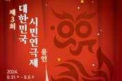 용인특례시(시장 이상일)는 ‘제3회 대한민국 시민연극제 용인’이 31일 개막식을 시작으로 9월 1일부터 8일까지 처인구 용인문화예술원 마루홀에서 열린다고 밝혔다. 문화예술원은 용인 시민의 문화 만족과 문화 복지 향상을 위하여 복합 문화 공간으로 문을 열었으며, 문화 예술 단체의 활동이 함께 어우러지는 공연·전시 문화 예술의 요람이다. 제3회 대한민국 시민연극제 용인은 경기도, 용인특례시, (사)한국연극협회가 주최하고 (사)한국연극협회 경기도지회, 제42회 대한민국연극제 집행위원회가 주관한다. 이번 연극제는 전국 16개 광역시·도 시민연극단체(극단, 동아리)가 참여하는 순수 아마추어 연극제다. 올해는 8개 극단이 공모를 통해 최종 경연에 올라 경기도민과 용인시민을 만난다. 개막식은 8월 31일 오후 4시에 열리는데 용인 생활예술 동아리가 참여하는 아트 마켓 행사를 비롯해 비보잉 공연, 연극제 홍보영상 상연, 축하공연 등이 이어질 예정이다. 9월1일부터 7일까지 용인문화예술원 3층 국제회의실에선 ‘연극사랑 시민 워크숍- 나의 독백, 쓰고 말하기’ 워크숍이 진행된다. 이 워크숍에 참여한 시민은 공연을 관람한 후 관객 평가단으로 심사에 참여할 수 있다. 경연 공연은
