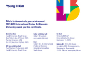 2025 제3회 BI 국제 포스터 비엔날레 최종 후보에 오른 작가가 발표되었습니다. 전 세계 67개국에서 1,316명의 작가가 총 4,026점의 작품을 출품했습니다. 제 작품(김영일 작가) 3개가 최종 후보로 선정되었습니다! 세계 유명 디자이너들과 함께 이 중요한 행사에 참여하게 되어 큰 영광입니다. 심사위원 단과 주최 측에 감사드립니다. 전시기간 : 2025년 9월 15일 ~ 10월 30일 인덕대학교 아중미술관 한국 상설전 : 2025년 10월 1일-갤러리BI, 한국 주최 : BIPB조직위원회,갤러리BI(한국) 공동주최 : 남서울대학교(대한민국) 한국문화상품디자인연구원(한국 퍼듀대학교(미국) 파트너십 : 퍼듀대학교(미국), PJAIT폴란드-일본아카데미(폴란드), 모홀리나지예술디자인대학교(헝가리), 메트로폴리탄대학 교(가리), 차나칼레온세키즈마트대학교(터키), 운타르대학교(인도네시아), 프라디타대학교(인도네시아), 포스 블로그(폴란드Wgd(인도네시아), 포스터테리토리(미국), 매스C&G(한국) https://gallerybi.imweb.me/140 김영일의 2025 제3회 BI 국제 포스터