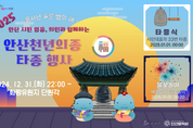 이민근 안산시장은 오는 31일 오후 10시부터 화랑유원지 단원각에서 ‘2025 안산 천년의 종 타종 행사’를 개최한다고 27일 밝혔다. ‘푸른 뱀의 해’인 2025년 을사년을 맞이하는 이번 행사는 오후 10시 식전행사로 시작된다. 새해맞이 신년운세 풀이와 함께 ▲안산 와리풍물놀이 ▲봉산탈춤(언락) ▲사물놀이(청악) ▲안산경기민요단 ▲안산시립합창단의 무대가 차례대로 펼쳐질 계획이다. 이후 23시 55분부터는 새해를 맞이하기 위한 타종 행사가 시작된다. 밤 12시 정각에 총 33회 타종을 울리는 행사에는 2024년 안산에 희망을 전했던 시민 영웅과 의인들이 함께 참여한다. 시의 발전과 시민들의 안녕을 기원하는 현장의 타종 행사가 끝난 이후에는 화려한 불꽃놀이가 시민들의 을사년 새해 첫날을 수놓을 예정이다. 한편, 현장에서는 포토존과 푸드트럭 등의 다양한 부대행사가 마련돼 겨울밤 행사장을 방문한 시민들에게 즐거움을 선사할 계획이다. 이민근 안산시장은 “한 해의 마무리와 한 해의 시작을 알리는 천년의 종 타종 행사에 시민들이 함께해 주시기를 바란다”라며 “시민과 참여자의 안전을 최우선으로 행사를 진행할 것”이라고 말했다.