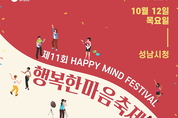 성남시는 오는 10월 12일 오전 10시~오후 3시 시청 1층 곳곳에서 ‘행복한 마음 축제’를 연다. 마음 축제는 시에서 세계 정신건강의 날(10.10)을 기념해 정신건강에 관한 중요성을 알리고, 정신장애에 대한 사회적 인식 개선을 도모하기 위해 마련하는 행사다. '세계 정신건강의 날'은 2017년 5월 30일부터 시행된 정신건강복지법(전면 개정)에 따라 매년 10월 10일로 제정된 법정 기념일로 ‘정신건강증진 및 정신질환자 복지서비스 지원에 관한 법률’에 따르면 정신건강의 중요성을 환기하고 정신질환에 대한 편견을 해소하기 위하여 매년 10월 10일을 정신건강의 날로 지정했다. 또한 ‘적정한 삶: 균형 잡힌 삶이 역량이 되는 시대’를 주제로 한 김경일 아주대학교 심리학과 교수의 초청 강연도 열린다. 시는 행사를 통해서 포스트 코로나 시대를 살아가는 현대인에게 전하는 마음의 위로와 통찰에 관해 이야기한다. 이날 온누리에선 정신건강에 대한 희망의 메시지를 담은 시민 인터뷰 영상을 상영하고, 정신건강 증진사업 유공자와 기관대표 5명을 표창한다. 정신건강 체험 부스도 11개를 전시하며 설치·운영해 마음 건강 자가검진, 자살 예방과 생명 존중 퀴즈 풀이, 투호 게임,