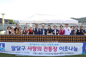 경기도전통음식협회·수요회 후원…된장 300개와 유리 항아리 전달 전통문화 계승과 다문화가정 참여로 이웃사랑 실천에 의미 더해 수원시 팔달구(구청장 이상균)는 11일 팔달구청 옥상에서 ‘사랑의 전통장(醬)이웃나눔’전달식을 열었다. 이날 행사에서 사단법인 경기도전통음식협회(회장 송정만)는 수원시 다문화가정협회,지역주민들과 함께 직접 담근 된장 300개를 관내 취약계층에 전달했다. 특히, 수요회 4조(조장 박민철)에서 전통 된장을 보관할 유리 항아리 300개를 후원하여 복지 사각지대 해소를 위한 행사의 의미를 더했다. 이번 ‘팔달구 사랑의 전통장 이웃나눔’은 전통문화 계승과 이웃사랑 봉사라는 한뜻으로 팔달구청과 경기도전통음식협회가 함께 지난 2월부터 직접 전통장을 담그며 시작됐다. 전통 방식으로 전통장 담그기 시연 및 안전한 먹거리 교육을 관내 다문화 다문화가정과 지역 어르신을 대상으로 진행하며 전통문화 활성화에도 기여했다. 이상균 팔달구청장은 “지역의 전통과 정성이 담긴 된장을 통해 이웃에 온정을 전할 수 있어 뜻깊다”며 “따뜻한 나눔을 실천해 주신 경기도전통음식협회와 수요회에 깊이 감사드린다”고 말했다. 팔달구는 앞으로도 다양한 민간단체와의 협력을 통해 지속적