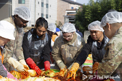 매년 여름김치와 겨울김장 참여로 한국 커뮤니티에 기여 한국과 미군은 전략적인 파트너, 소외계층에도 동일한 관심 미8군 예하 제1통신여단은 15일 팽성읍자원봉사나눔센터와 공동으로 지역 내 소외계층을 위한 ’김장김치 나눔봉사‘를 진행했다. 한국 지역사회에 기여하고 전략적인 파트너 관계를 유지하고자 군은 매년 여름김치와 겨울김장 봉사, 지역아동센터와의 문화교류 시간을 보내왔다. 이날 김장봉사는 자원자인 11명의 장병과 봉사자 13명이 함께 했고 오전 8시 15분부터 12시까지 200포기 김치를 만들었다. 완성된 김치는 읍내 소외계층에게 전달하고자 각각 소분하여 담아냈다. 잔슨 하사는 ”제가 하는 군 일 외에 한국 커뮤니티에 기여하는 게 의미 있다. 벌써 미국에 있는 가족에게도 김장을 알렸다. 가족들이 신기해하고 좋아한다.”라고 말했다. 팽성읍자원봉사센터 봉사자들은 ”옛날 만 포기 할 때도 군 장병들의 도움이 컸다. 매년 미군들이 함께해줘서 큰 힘이 되며 고맙다.”라고 말했다. 미8군 군종(소령)은“미군의 한국사회 참여와 기여로 전략적 파트너 관계가 지속된다. 소외계층을 위해 도움을 주는 일에 동참하는 것은 군으로 당연히 해야 할”이라고 밝혔다.