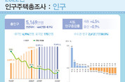 대한민국 총인구 5,169만명, 0,1% 인구 줄어 통계청의 '2022 인구주택총조사’에서 대한민국 국민은 전년 대비 약 4만 6,000명이 줄어들어 인구성장률이 –0.1%로 2년 연속 마이너스 수치를 기록했다. 내국인은 4천994만명(96.6%), 외국인은 175만2천명(3.4%)으로 전년 대비 내국인은 14만8천명(-0.3%) 감소, 외국인은 10만2천명(6.2%) 증가했다. 연평균 인구 증감률(인구성장률)은 2022년 –0.1%이다. 2년 연속 마이너스이다. 총인구의 26.5%는 경기도에 거주, 1천371만8천명으로 꾸준히 인구 증가(0.5%) 수도권 전체인구의 50.5%(2천612만4천명) 거주 시도별 인구는 경기가 26.5%(1천371만8천명)로 가장 많다. 서울 18.2%(941만7천명), 부산 6.4%(329만6천명), 경남 6.3%(328만1천명) 순이다. 지난 1년간 7개 시도(세종, 인천, 충남, 제주, 경기, 강원, 충북)의 인구는 증가, 그 외 10개 시도의 인구는 감소했다. 전년 대비 인구 증가율이 큰 시도는 세종(4.5%), 인천(1.1%), 충남(0.8%), 제주 경기(0.5%)순, 인구 감소율은 큰 시도는 울산․대구․부산(-0.9