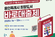 이상일 용인특례시장은 1월 2일부터 ‘희망도서 바로대출제’를 시행한다고 1일 밝혔다. 2015년 용인시에서 전국 최초로 시작된 희망도서 바로대출제는 동네 서점에서 읽고 싶은 신간을 빌려보고 서점으로 반납하는 제도로, 지난 한 해 이 제도를 활용해 시민 2만 7,874명이 4만 4,056권의 책을 빌려봤다. 용인시도서관 정회원이라면 누구나 지역 내 지정된 23곳의 서점에서 1인당 월 2회까지 신간을 빌려볼 수 있다. 도서관 홈페이지(https://lib.yongin.go.kr/)에서 방문할 서점을 선택하고 희망 도서를 신청한 뒤 대출 승인 문자를 받아 해당 서점을 방문하면 책을 빌릴 수 있다. 대출기간은 14일이며 1회에 한해 7일까지 연장할 수 있다. 책을 다 읽은 뒤 대출한 서점으로 반납하면 도서관에서 해당 책을 구입 해 장서로 등록한다. 올해 희망도서 바로대출제에 참여하는 서점은 처인구 6곳, 기흥구 7곳, 수지구 10곳 등 총 23곳이다. 처인구는 명지문고(역북동), 빈칸놀이터(마평동), 생각을 담는 집(원삼면), 365북스(원삼면), 용인문고(김량장동), 최강서점(포곡읍) 등이다. 기흥구에선 구갈대지서점(구갈동), 그냥책방(신갈동), 동백문고(중동),