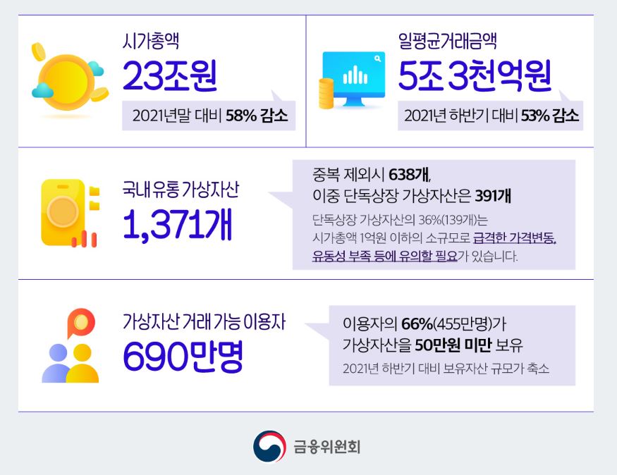 작년 상반기 금융위원회는 가상자산사업자 실태조사를 벌였고 9월 결과를 발표했다. 그 결과 국내 가상자산시장(신고된 35개 사업자)은 시가총액 23조원, 일평균거래금액은 5조 3천억원, 국내유통가상자산은 1, 371개이며 중복 제외시 638개, 이중 단독상장 가상자산은 391개였다. 또한, 가상자산 거래 가능 이용자가 690만명으로 이용자의 66%(455만명)가 가상자산을 50만원 미만 보유하고 있었다. 이렇게 가상자산 규모가 커지면서 정부의 관리 감독 또한 강화되고 있다.