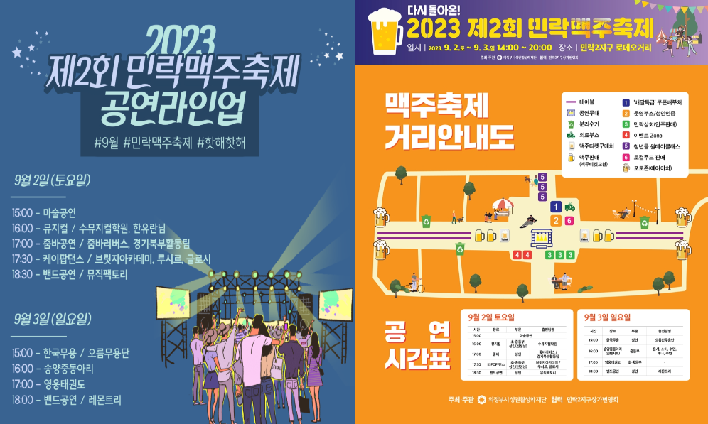 (재)의정부시상권활성화재단은 9월 2일과 3일 양일간 도심 속 공간을 시원한 맥주를 즐길 수 있는 휴게공간으로 바꾸는 ‘2023년 제2회 민락맥주축제’를 개최한다.