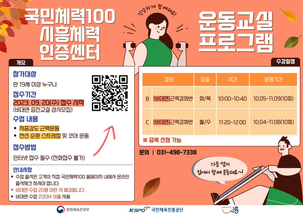 시흥시(시장 임병택)가 운영하는 국민체력100 시흥체력인증센터에서 ‘2023년 비대면 근력 강화 운동교실’에 함께할 시민을 9월 20일부터 모집한다.