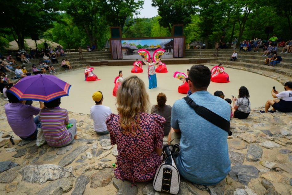 한국민속촌의 야외 공연마당에서 부채춤 공연도 진행되었으니, 사회적 거리두기가 시작되기 전 상황인 것이다. 본 작가가 자리한 공연장 앞자리에 외국인 부부가 한국부채춤 공연을 유심히 관람하는 모습이 포착되어 담았다. 뒷모습의 포착이어서 어느 나라에서 왔는지 묻는 걸 잊었다. (외국인들은 사진 찍히는 것에 대해 다소 너그러운 모습이지만 본 작가가 찍은 것은 뒷모습이어서 전해주는 걸 더욱 간과한 것 같다)