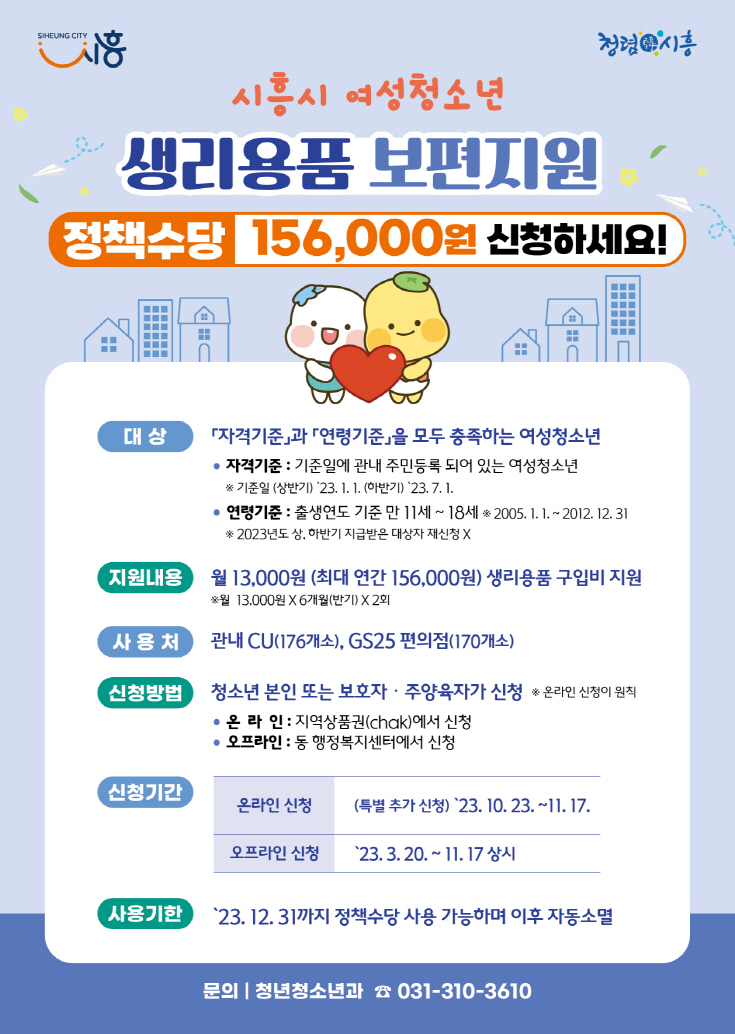 대상 청소년은 시흥시 내 주민등록을 둔 만 11세~18세(2005년 1월 1일~2012년 12월 31일 출생) 여성청소년이 해당된다. 단, 여성가족부 사업 지원금(여성청소년 생리용품 바우처 지원)을 받는 청소년들은 중복으로 지원금을 받을 수 없다. 또한, 2023년 12월 31일 이후 지원금이 소멸이 되기 때문에 기한 내에 사용해야 한다.