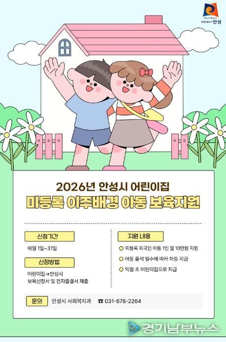 [경기남부뉴스 김혜숙 기자] 안성시는 2026년부터 어린이집에 다니는 미등록 외국인(이주배경) 영유아에게 월 10만원의 보육지원금을 지원한다고 밝혔다.