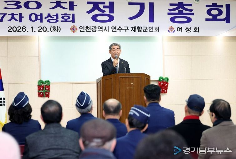 [경기남부뉴스 김혜숙 기자] 인천광역시의회 정해권 의장(국·연수구1)은 20일 인천시 연수구 보훈회관에서 열린 ‘2026년 제30차 연수구 재향군인회 및 제27차 연수구 재향군인회 여성회 정기총회’에 참석해 회원들을 격려했다.