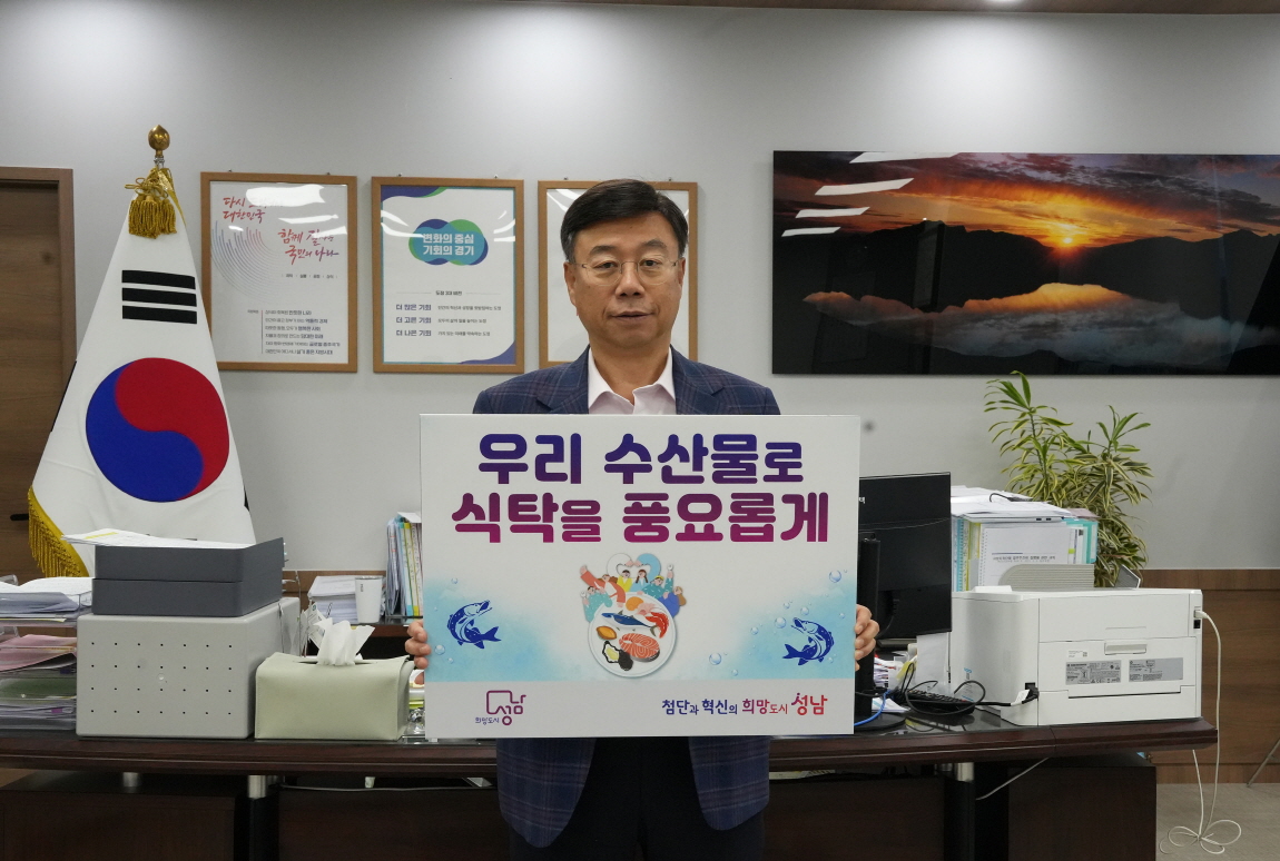 박경귀 아산시장의 지명을 받아 챌린지에 참여한 신상진 시장은 이날 ‘우리 수산물로 식탁을 풍요롭게’라는 문구와 함께 촬영한 인증사진을 개인 사회관계망서비스(SNS)에 게재하였다.