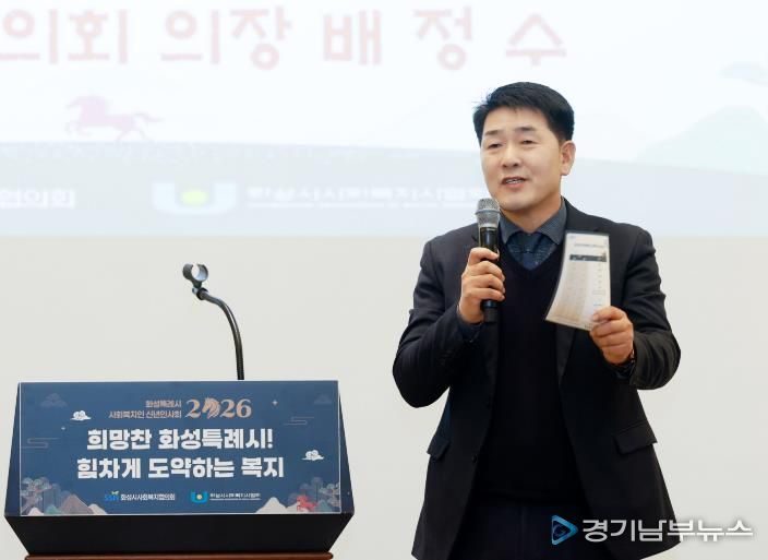 [경기남부뉴스 홍복순 기자] 화성특례시의회는 26일 호텔 푸르미르 그랜드볼룸에서 열린 '2026년 화성시사회복지협의회·사회복지사협회 신년인사회'에 참석해, 병오년 새해를 맞아 사회복지 종사자들과 함께 희망과 연대의 뜻을 나눴다.