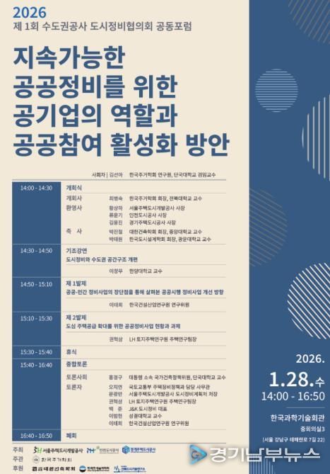 [경기남부뉴스 김혜숙 기자] 경기주택도시공사(GH)는 1월 28일 서울 강남구 한국과학기술회관에서 서울주택도시개발공사(SH), 인천도시공사(iH)와 공동으로 ‘수도권 공사 도시정비협의회 공동포럼’을 개최한다고 27일 밝혔다.