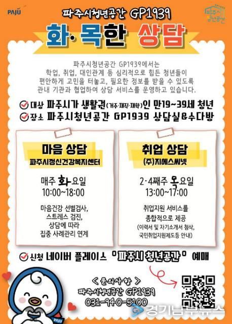[경기남부뉴스 김혜숙 기자] 파주시는 청년들의 심리 안정과 취업 역량 강화를 위해 파주시청년공간 지피(GP)1939에서 진행하는 상담 프로그램 ‘화·목한 상담’의 참여자를 모집한다.