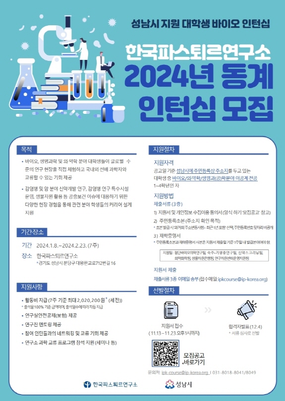 참여를 원하는 대학생은 오는 23일 오후 1시까지 성남시 홈페이지나 한국파스퇴르연구소 홈페이지(공고문)에 게재된 이메일로 지원서를 보내면 된다.