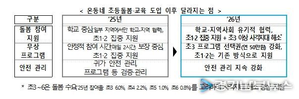 교육부는 2024년부터 늘봄학교 정책을 통해 초등학교 1‧2학년의 돌봄 공백 해소를 집중적으로 지원해 왔다. 2026년부터는 기존의 늘봄학교를 ‘온동네 초등돌봄‧교육’ 정책으로 발전시켜, ①학교와 지역사회가 함께 희망하는 초등학생에게 사각지대 없는 돌봄을 제공하고, ②돌봄보다 교육에 대한 수요가 큰 초등학교 3학년 이상 학생*의 방과후 교육 참여를 중점 지원한다.