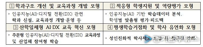 교육부는 2026년 신규 사업 공모를 통해 총 24개 내외 사업단(전문대학)을 선정하여 사업단별 최대 10억 원(총 240억 원)을 지원할 예정이다. 주요 추진 내용으로는 ▲인공지능(AI)·디지털 전환(DX) 환경 조성, ▲재학생·교직원·지역주민 맞춤형 인공지능(AI) 역량 강화, ▲대학별 특화모형 구축이 있다.