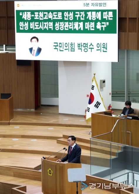 [경기남부뉴스 김혜숙 기자] 경기도의회 도시환경위원회 박명수 의원(국민의힘, 안성2)은 5일 열린 제388회 임시회 본회의 5분 자유발언을 통해 세종~포천고속도로 안성 구간 개통 이후 급증하는 개발 수요에 대비한 비도시지역 성장관리체계 부재 문제를 지적하며, 경기도의 선제적 대응과 책임 있는 정책 결단을 촉구했다.