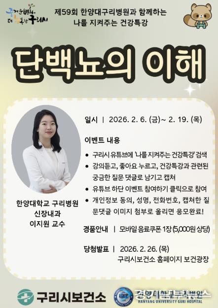 [경기남부뉴스 김혜숙 기자] 구리시는 시민의 건강한 생활 실천과 질환 예방을 돕기 위해 6일부터 유튜브를 통해 건강특강 '단백뇨의 이해'를 공개한다고 밝혔다.