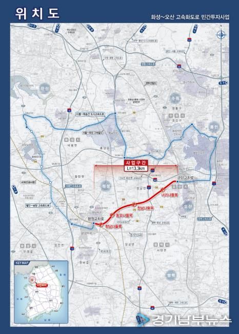 이 사업은 화성시 향남읍에서 오산시 금암동까지 약 13.3km 구간을 연결하는 왕복 4차로 자동차전용도로를 건설하는 것으로, 개통 시 수도권 서남부 지역의 교통 혼잡 해소와 이동 시간 단축, 산업·주거지역 접근성 개선에 크게 기여할 것으로 기대된다.
