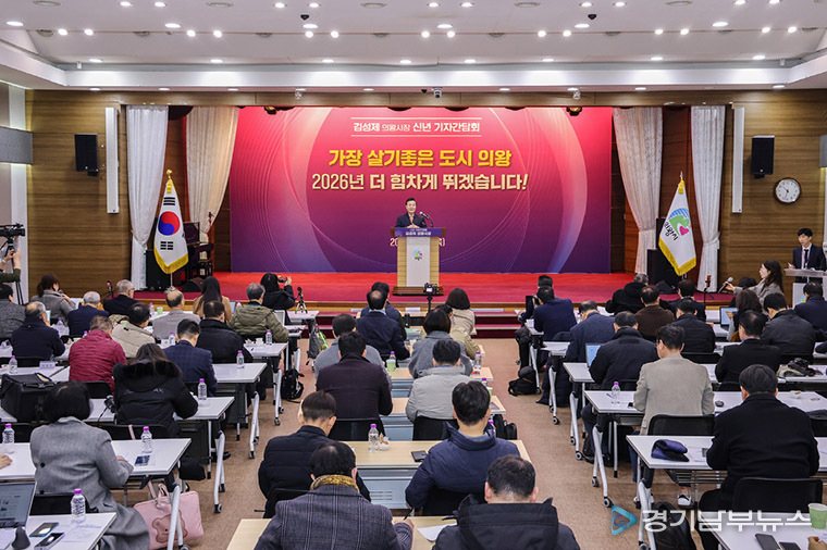 5일 신년 기자간담회가 열렸다. 김성제 의왕시장이 복귀를 알렸다. 심근경색으로 쓰러진 지 53일 만이다. 생존확률 10%, 후유증 없이 회복할 확률 5%. 기적에 가까운 회복이었다. 하늘이 도왔다고 말하는 김성제 의왕시장은 이날 건재함을 알렸다. 그는 1만5천 세대 규모의 오전·왕곡 신도시, 2029년 복선전철 개통 등 의왕의 대변화를 예고하면서도 안양교도소 경계 침범 문제에는 강력한 경고 메시지를 보냈다.