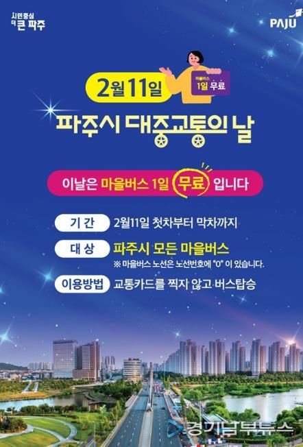 [경기남부뉴스 김혜숙 기자] 파주시는 ‘대중교통의 날’을 맞아 대중교통 이용 활성화와 시민 교통비 부담 완화를 위해 오는 2월 11일 하루 동안 파주시 전 지역의 모든 마을버스를 무료로 운행한다.