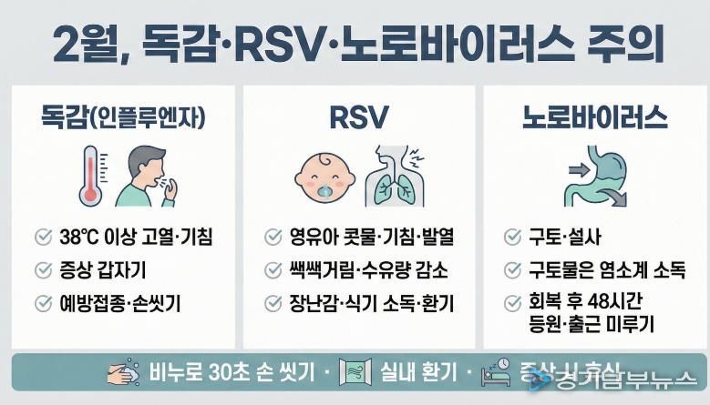 [경기남부뉴스 김혜숙 기자] 평택시는 2월은 실내 생활이 늘고 환기 부족으로 독감(인플루엔자)·호흡기세포융합바이러스(RSV)·노로바이러스 등 감염병이 유행할 수 있다며 시민들에게 개인위생 수칙 준수를 당부했다.