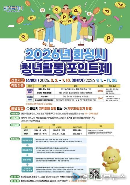 [경기남부뉴스 김정옥 기자] 화성특례시는 청년의 시정 참여와 지역사회 활동을 지원하기 위해 오는 3월 2일부터‘2026년 청년활동포인트제’를 본격 시행한다.
