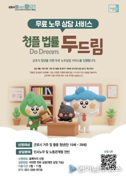 [경기남부뉴스 김혜숙 기자] 군포시 청년공간 플라잉은 관내 청년들의 노동권 보호와 일상생활 속 법률 고충 해결을 위해 무료 전문 상담 서비스인 ‘청플 법률 두드림(Do Dream)’을 본격 운영한다고 밝혔다.